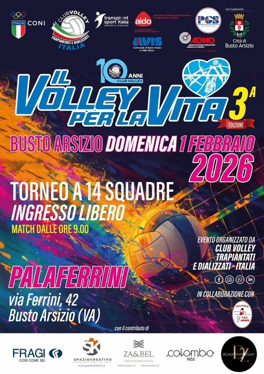 Il programma della giornata si preannuncia intenso: 14 squadre si sfideranno a partire dalle 9 su quattro campi, occupando l'intera struttura del PalaFerrini. Si prevede una maratona di volley che conterà una settantina di partite, per arrivare alle premiazioni finali intorno alle 18:30. Insieme al Pgs Aurora di Busto, società di appartenenza di Zausio, saranno presenti anche Aido, Avis e Admo per ribadire l'importanza della prevenzione e del dono.