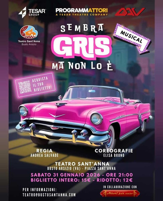 Manca poco: il 31 gennaio, la compagnia “Attori per caso” riporta in scena al Teatro Sant’Anna di Busto “Sembra Gris ma non lo è”. Lo spettacolo è ovviamente ispirato a “Grease”, successo planetario a teatro e al cinema. L’adattamento (interamente cantato dal vivo) nasce dalla collaborazione tra gli Attori per Caso e la società Tesar Spa: il punto di partenza è stato un team building destinato ai dipendenti. Ma da cosa nasce cosa, da un’esibizione applaudita scaturisce quella successiva. Così “Gris” è diventato un musical fondato sulla collaborazione tra le compagnie "Attori per caso" e "I programmattori", con richieste di repliche da diverse associazioni (le esibizioni di “Attori per caso” sono regolarmente associate a raccolte fondi per cause meritevoli).