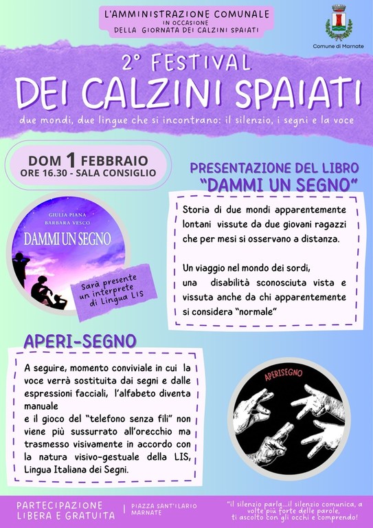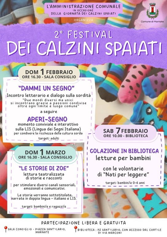 Il Festival dei Calzini Spaiati, infine, si concluderà domenica 1 marzo alle 16.30 quando, in sala consiglio, i bambini e i ragazzi marnatesi potranno assistere a “Le storie di Zoe”, una lettura teatralizzata di storie e racconti, che saranno anche sottotitolati e narrati in doppia lingua, italiano e LIS, pensati per stimolare diversi canali sensoriali, emozionali e comunicativi.