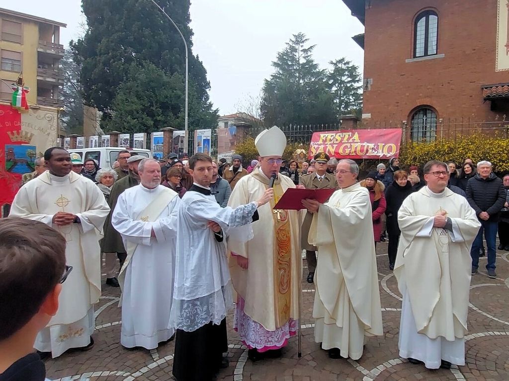 Dopo questa introduzione monsignor Marinoni ha benedetto la torre campanaria, dalla cima della quale ha iniziato a diffondersi il suono delle campane di San Giulio; un ritorno che è stato accolto dal silenzio della piazza che, dopo pochi secondi è scoppiata in un fragoroso applauso, dando il bentornato alla voce del suo campanile, che per troppo tempo ha dovuto tacere a causa dei lavori.