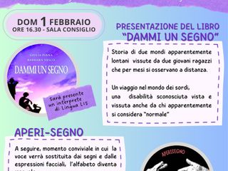 Ad aprire il festival, oggi in sala consiglio alle 16.30, la presentazione, con la partecipazione di un interprete di Lingua LIS, del libro di Giulia Piana e Barbara Vesco “Dammi un segno”, in cui sono raccontati due lingue che si incontrano: il silenzio, i segni e la voce, attraverso la storia di due mondi apparentemente lontani vissute da due giovani ragazzi che per mesi si osservano a distanza.
