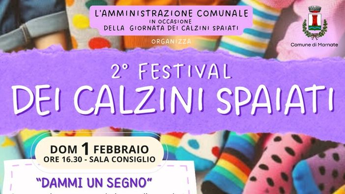 Ancora una volta il comune di Marnate ha deciso di dedicare una serie di iniziative in onore della giornata dei Calzini Spaiati, pensata per far comprendere che ciascuno di noi è unico e speciale, e che, a ben pensarci, non siamo noi a essere diversi, ma sono solo differenti gli strumenti necessari ad ognuno per interagire con gli altri e il mondo che ci circonda. Dopo il successo dello scorso anno, dunque, torna in paese il “Festival dei Calzini Spaiati”, che dal 1 febbraio al 1 marzo vedrà la Sala Consiglio e la Biblioteca ospitare una serie di iniziative dedicate a tutte le età.