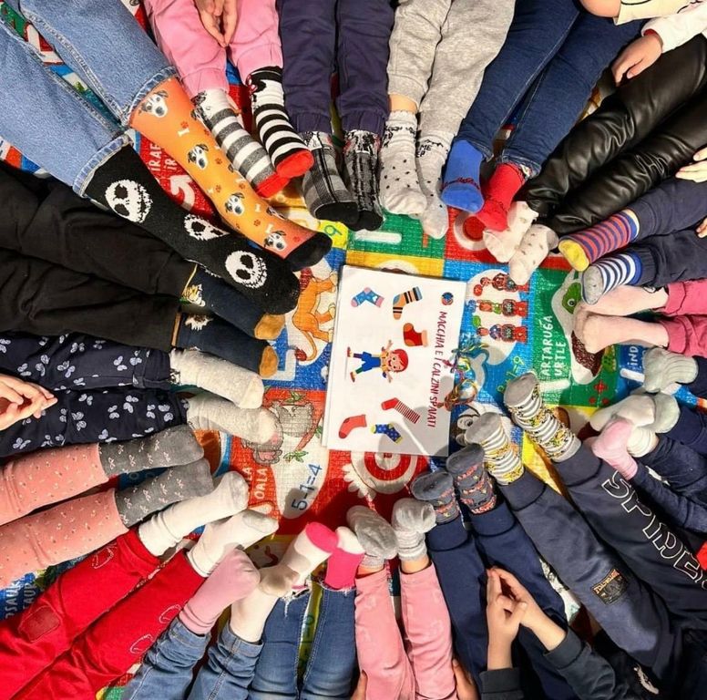 «Durante questa giornata chiediamo ai bambini di venire a scuola indossando due calzini spaiati, non uguali; con questo piccolo gesto riusciamo a mostrargli in maniera immediata cosa intendiamo con “differenze”. Per loro diventa un giorno di festa, durante il quale mostrano con fierezza le loro calze “single” e le confrontano con quelle dei compagni e delle maestre» dice Giulia che continua col racconto pratico delle attività previste nella sua classe: «con i bambini iniziamo proprio dalla base con un gioco: in una scatola inseriamo un piccolo specchio, a turno ogni bambino apre la scatola e guarda cosa c’è dentro ma gli si chiede di mantenere il segreto fino a quando tutti avranno visto all’interno. Alla fine chiedo cosa hanno visto nella scatola ma rispondere non è facile, piano piano riescono a capire che nella scatola c’erano proprio loro, ognuno con le proprie caratteristiche. Ci concentriamo sulle differenze fisiche: “maestra Giulia ha i capelli lunghi e lisci; maestra Alessia ha i capelli ricci; una compagna ha i capelli biondi. Maestra Giulia è più grande e per questo è più alta. Maestra Giulia ha tanti anni, invece noi siamo più piccoli”. Queste sono le frasi tipiche che dicono i bambini e intanto, divertendosi, iniziano a notare che siamo tutti diversi. Partendo da queste differenze visibili immediatamente, sviluppiamo l’empatia dei più piccoli e li prepariamo ad accettare se stessi e gli altri. In classe leggiamo storie, racconti e canzoni. Ed è proprio con una frase tratta dalla storia Macchia e i calzini spaiati, sulla quale mi soffermo spesso anche con la mia classe, che voglio lanciare a tutti un messaggio per la riflessione: “Perché il bello dei calzini è proprio questo: ci ricordano che siamo tutti diversi e che essere spaiati, unici, non è poi così male se impariamo a volerci bene. Guardate i calzini spaiati stesi sul filo: tutti insieme, non sono bellissimi?”».