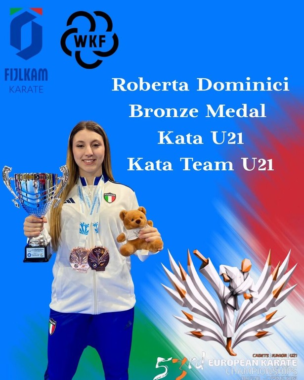 Ottimo anche il risultato nella gara di kata a squadre, dove Roberta Dominici ha gareggiato insieme alle compagne conquistando un altro bronzo europeo. Un risultato di grande rilievo, impreziosito dal ruolo di capitano ricoperto dall’atleta azzurra, che avrebbe dovuto guidare la squadra anche nella fase conclusiva con l’esecuzione del Bunkai, elemento fondamentale della prova a squadre e simbolo di leadership e responsabilità tecnica.