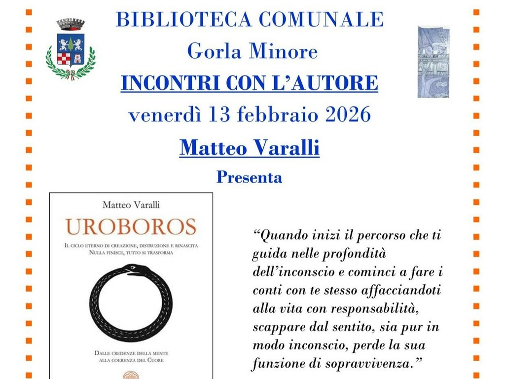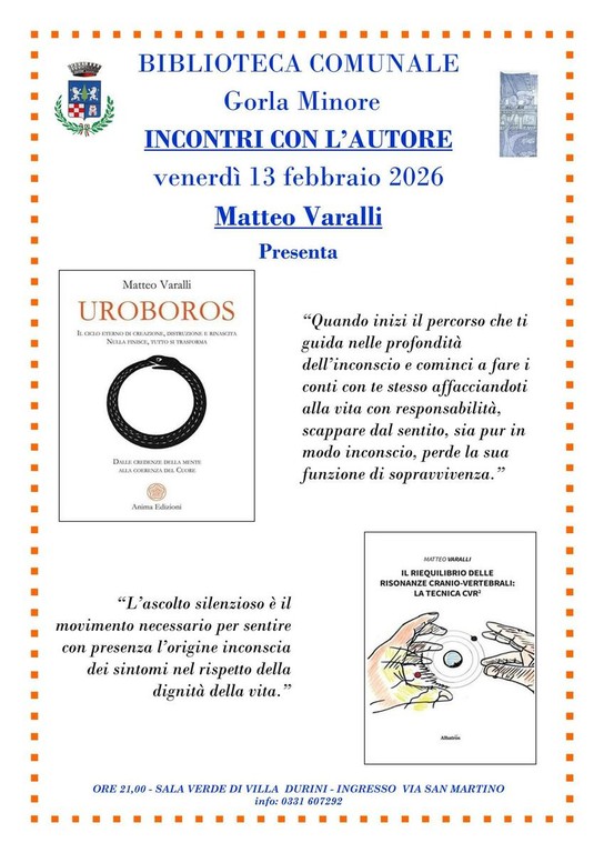 A partire dalle 21 di venerdì 13 febbraio, la Sala Verde di Villa Durini a Gorla Minore ospiterà l’incontro con l’autore Matteo Varalli, che presenterà i suoi libri “Uroboros. Il ciclo eterno di creazione, distruzione e rinascita nulla finisce, tutto si trasforma” e “Il riequilibrio delle risonanze cranio-vertebrali: la tecnica cvr2”, organizzato in collaborazione con la Biblioteca comunale.
