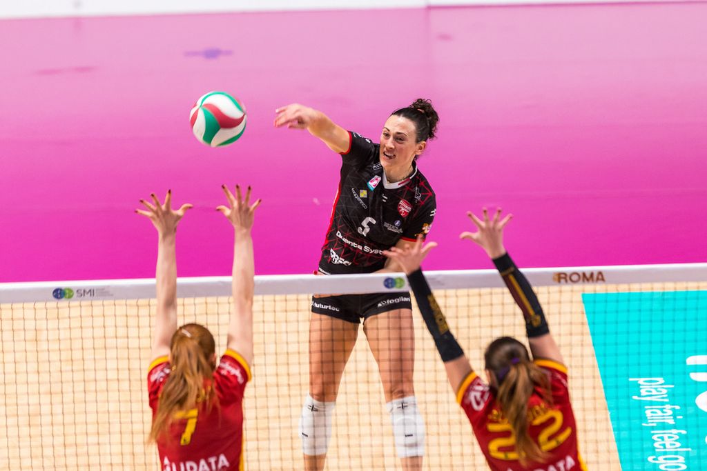 Torna Longobardi per Orlandi di banda e la frazione in avvio regala un insolito equilibrio (4-4, 6-7, 9-10). Rebora e compagne lottano davvero con grande garra e tentano la fuga (9-12 con muro di Sassolini, 11-14). Roma risale e impatta al 15 ma è ancora Busto Arsizio ad allungare l’elastico con un 4-0 firmato tutto da Longobardi e dal gran lavoro sporco di una splendida Talarico (15-20). Mason interrompe il break di 6-0 delle ospiti e risveglia la SMI (18-21) ma Farina rientra in campo e stampa subito il muro del 18-23, preludio al 21-25 firmato da Enneking.