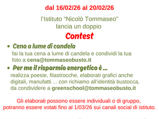 Saranno dedicate riflessioni e approfondimenti sulla tematica della Giornata Nazionale del Risparmio Energetico e degli Stili di Vita Sostenibili; sarà possibile aderire alla consolidata iniziativa de “La cena a lume di candela” da realizzarsi preferibilmente dal giorno 16 febbraio ed entro il giorno 20 febbraio 2026 che, come lo scorso anno, diventa Contest unitamente a “Per me il risparmio energetico è…”.