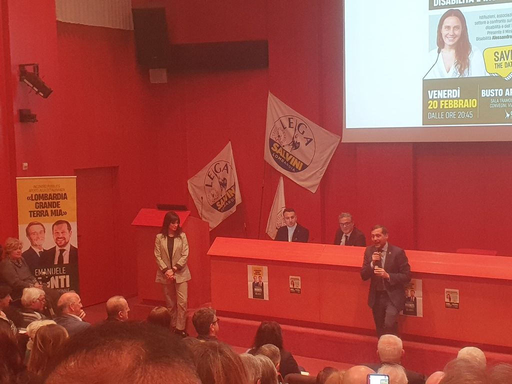 Amministratori locali, associazioni del terzo settore, cittadini: sala Tramogge stracolma a Busto Arsizio, venerdì, per la serata con il ministro per le Disabilità Alessandra Locatelli organizzata dal consigliere regionale leghista Emanuele Monti.