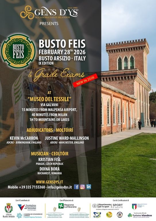 Dove: Museo del Tessile, Via Volta 6, Busto Arsizio (VA); quando: Sabato 28 febbraio 2026 Orari: Competizioni 8:00-19:00 | Ceili Night dalle 21:00; biglietti (acquistabili in loco):