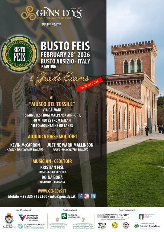Dove: Museo del Tessile, Via Volta 6, Busto Arsizio (VA); quando: Sabato 28 febbraio 2026 Orari: Competizioni 8:00-19:00 | Ceili Night dalle 21:00; biglietti (acquistabili in loco):