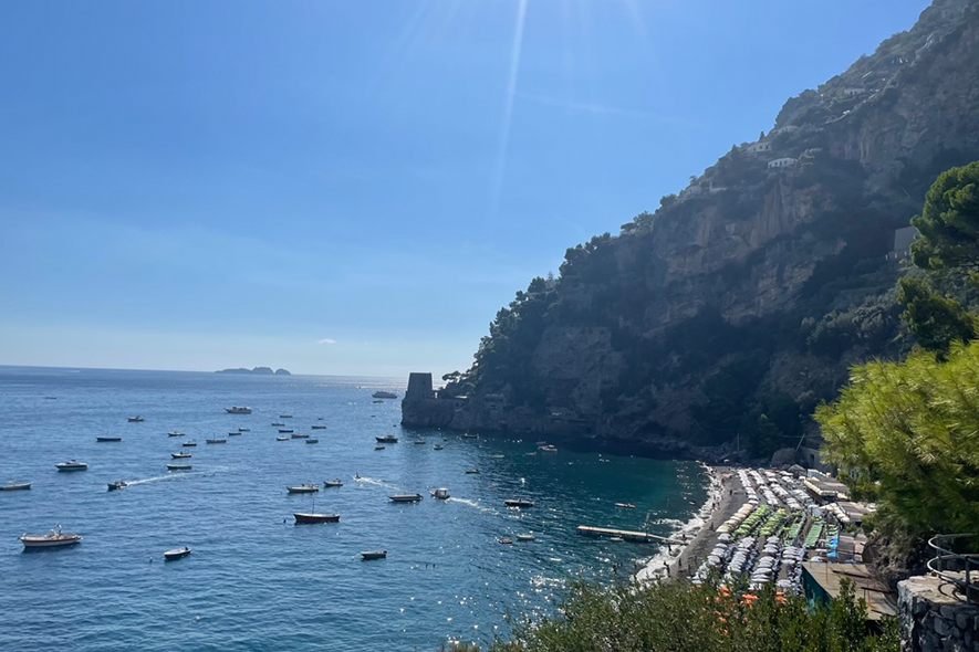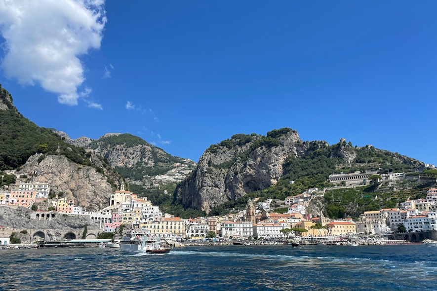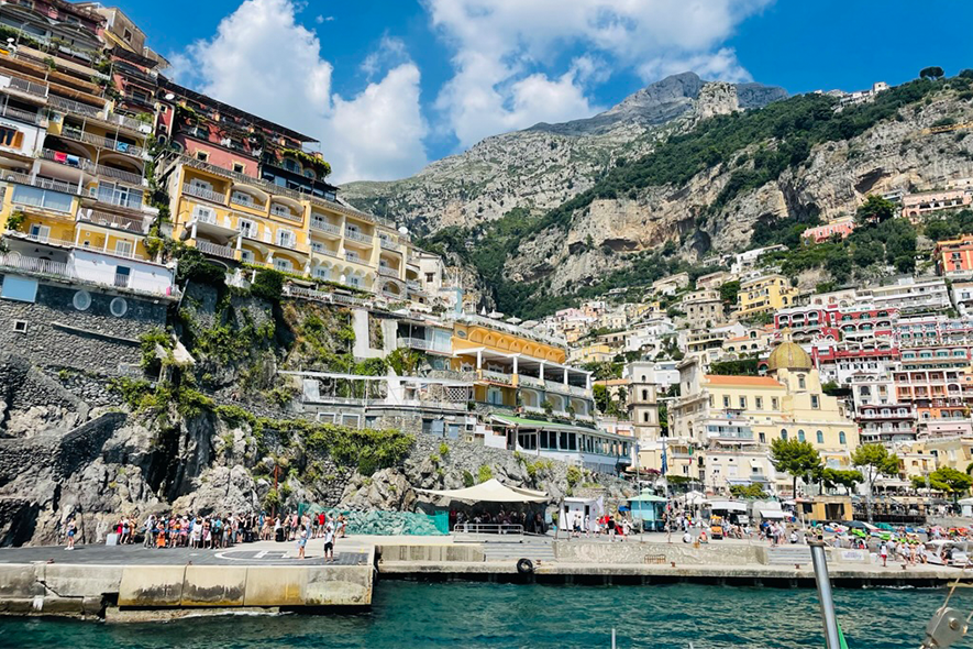 Proseguendo in battello, si arriva a Positano. L’immagine più diffusa e iconica della Costiera. Dal mare si presenta come una diagonale netta: una sequenza ordinata di volumi, tra rosa pallido, pesca e bianco. Terrazze sovrapposte e balconi fioriti costruiscono un’immagine riconoscibile, modellata sul profilo del promontorio. L’impatto visivo è forte e coerente. L’economia locale è fortemente orientata all’accoglienza: boutique, hotel panoramici e ristoranti affacciati sul mare testimoniano una trasformazione che ha consolidato la vocazione turistica del paese. La bellezza è organizzata e resa esperienza strutturata.