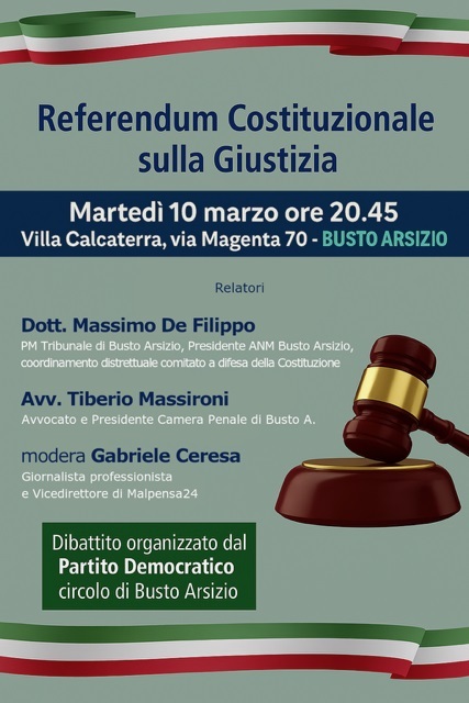 Il Partito Democratico di Busto Arsizio organizza un dibattito pubblico sul referendum costituzionale sulla giustizia in programma il 22 e 23 marzo. L’incontro si terrà martedì 10 marzo alle 20.45 a Villa Calcaterra, in via Magenta 70.