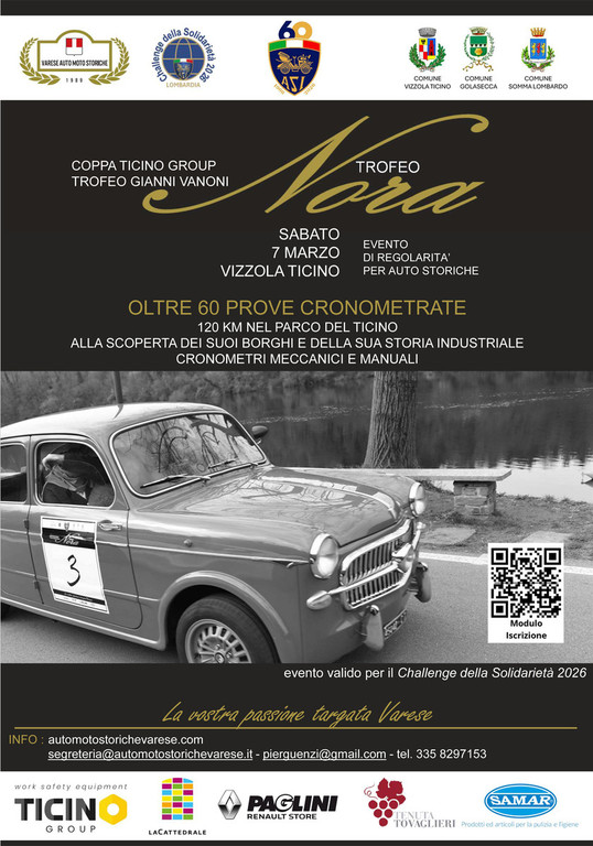 Alto il livello qualitativo degli iscritti al Nora ’26 con pretendenti al podio come Massimo Bisi, Sergio Mazzoleni, Antonio D’Antinone, Maurizio Magnoni, ‘Magico Alverman’, Enrico Falcetta, Maurizio Causo, Matteo Lozza, Alberto Diana. Con i crono meccanici molto agguerriti gli specialisti del club Gallarate Auto Moto Storiche, Gionata Costante, Carlo Genoni, Diego Pessina, Paolo Beretta che rivaleggiano con quelli del club Vams Varese, Christian Marcon, Giorgio Uboldi, Paolo Primi, Luigi Cicconofri. Tre le pilotesse al via, Arianna Lozza (Austin I4 n.19), Himara Bottini (Porsche 911 n.21) e Chiara Magnaghi (Triumph Spitfire Mk3 n.77).