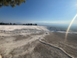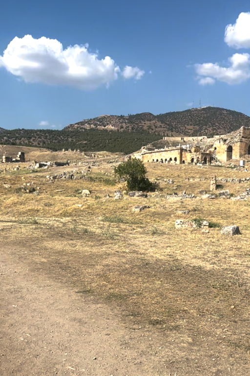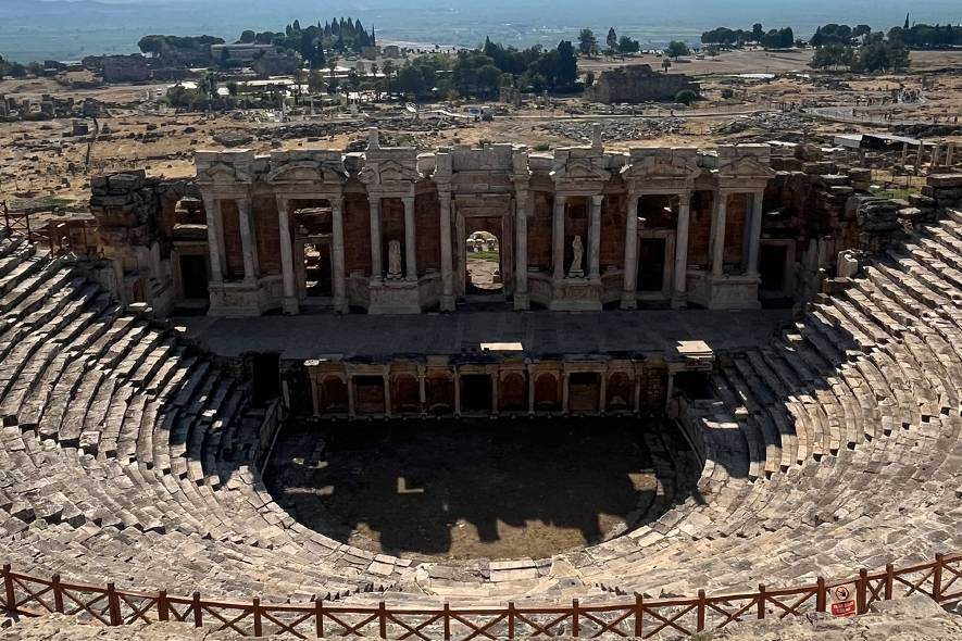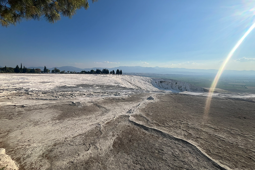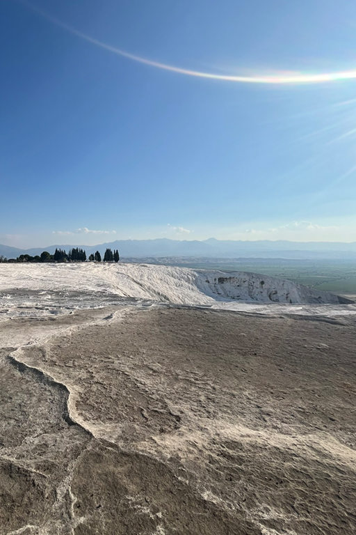 Lasciato questo luogo, la pianura riprende la parola. Per chilometri non accade quasi nulla. Poi la superficie cambia colore. Una scarpata bianca appare come un errore ottico nel paesaggio: Pamukkale. Le terrazze calcaree non sono un effetto scenografico ma il risultato di un processo millenario. L’acqua termale deposita carbonato di calcio, strato dopo strato. Il bianco non è candore: è accumulo. È il segno visibile di un tempo che sedimenta con pazienza. Camminare su quelle superfici significa percepire una materia che continua a trasformarsi anche quando sembra cristallizzata. Le vasche riflettono il cielo, ma sotto la superficie l’acqua lavora ancora. Sopra le terrazze si estendono le rovine di Hierapolis. Teatro, necropoli, strade ortogonali: la città romana osservava la valle con sicurezza ingegneristica. Qui natura e progetto umano condividono lo stesso panorama. La pietra scavata dall’uomo e quella depositata dall’acqua convivono senza conflitto. Pamukkale non racconta una vittoria, ma una coabitazione. La solidità come visione nei “secoli dei secoli”.