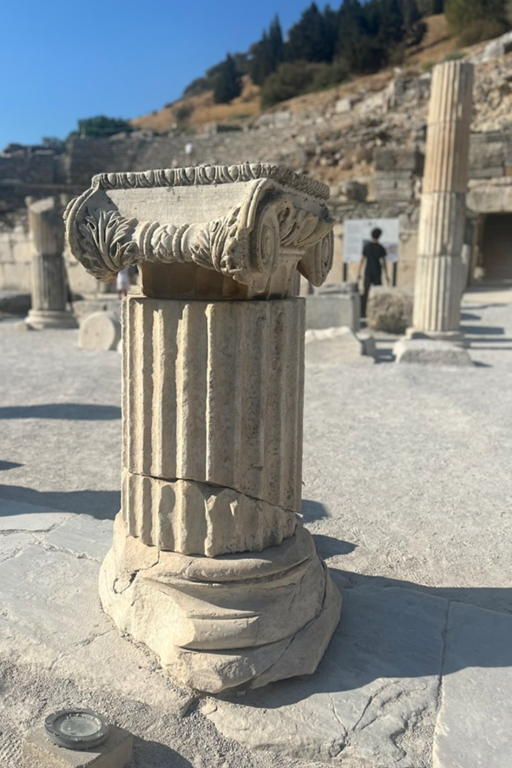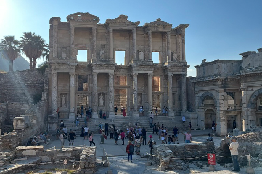 Scendendo verso la costa dell’Egeo, l’aria si fa più umida. Gli ulivi occupano le colline con eleganza geometrica. Tra pendii chiari e sentieri polverosi appare Efeso. Non è solo un sito archeologico: è la testimonianza di un sistema urbano complesso. La via principale scende, verso il basso, tra pavimentazione perfetta e capitelli caduti. Commercio, culto, politica: tutto organizzato con precisione romana. La Biblioteca di Celso domina la prospettiva. La facciata, con colonne sovrapposte e nicchie allegoriche, è un manifesto di comunicazione visiva. È un edificio pensato per essere guardato frontalmente, per produrre consenso attraverso la proporzione. I visitatori si dispongono davanti come un pubblico in attesa dello spettacolo. Poco oltre, il Grande Teatro apre la sua curva verso la pianura: migliaia di posti scolpiti nella collina, un’architettura che organizza voce e sguardo. Efeso non suggerisce malinconia. È un manuale a cielo aperto su come si viveva. Ma è anche la dimostrazione di come le “cose" cambino.