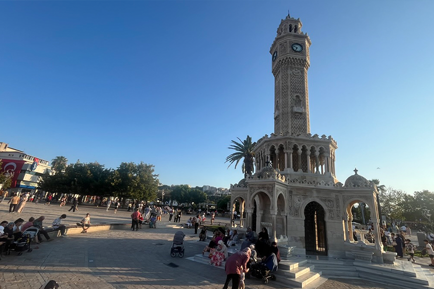 Il porto si è insabbiato, il commercio si è spostato, la centralità si è dissolta. La città è rimasta come un diagramma di ciò che non era più possibile fare. L’ultimo capitolo si affaccia sul mare, a Smirne. Qui non dominano le rovine ma la continuità. La Torre dell’Orologio rappresenta la città con eleganza ottomana, ma attorno il traffico, i tram, i caffè sul lungomare parlano un linguaggio contemporaneo. Il golfo raccoglie la luce del tardo pomeriggio, le palme disegnano ombre lunghe sulla piazza. Le persone si siedono, parlano, camminano. Nessuna scenografia imposta: solo uso quotidiano dello spazio. Dopo caravanserragli, rituali rotanti, città minerali e sistemi urbani romani, Smirne sceglie la normalità come definizione identitaria. La storia qui non è assente; è incorporata. Non viene esibita come reliquia, ma funziona come infrastruttura invisibile. È porto, commercio, scambio — ancora una volta funzione prima che spettacolo.