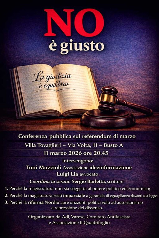 Non casualmente sostennero la necessità di realizzare la separazione delle carriere sia Gelli sia Berlusconi. Per la rilevanza della questione, per la sua complessità e per il significativo impatto che questa riforma avrà sulla vita di noi cittadini, vi invitiamo a ‘NO È GIUSTO’, incontro pubblico organizzato da ADL Varese, dal Comitato Antifascista e dall’Associazione Il Quadrifoglio, che si terrà il giorno 11 marzo alle 20.45 a Villa Tovaglieri, in via Volta 11 a Busto Arsizio. Lo scrittore Sergio Barletta coordinerà la serata, durante la quale interverranno l’avvocato Luigi Lia e Toni Muzzioli dell’associazione Ideeinformazione. Il dibattito fornirà l’occasione a tutti per chiarire dubbi e perplessità e svelare le reali intenzioni di questo governo e degli accoliti che si celano dietro questo referendum».