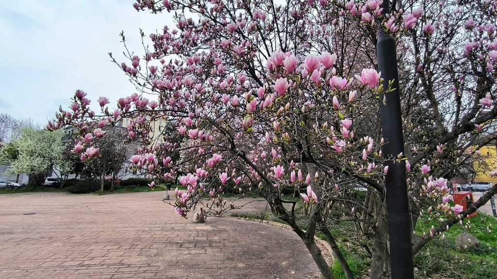 Corre la primavera, nonostante il cielo incerto di questi giorni a Busto Arsizio. Ma quest'anno sono partite con un anticipo ancora lievemente accentuato rispetto all'anno scorso le fioriture (LEGGI QUI). Rapidamente si sono colorati di rosa viali, giardini e piazzali. Come al solito, è piazzale Facchinetti - quello delle Poste, semplicemente, per molti bustocchi - a dare il via alle prove di primavera.