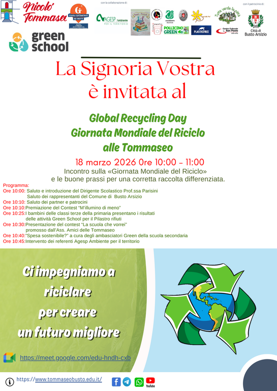 La comunità scolastica dell’Istituto Comprensivo “Nicolò Tommaseo” di Busto Arsizio il 18 marzo 2026 celebrerà la Giornata Mondiale del Riciclo - Global Recycling Day con momenti di approfondimenti didattico ed extra curriculare e una tavola rotonda (vedi programma nel file in fondo).