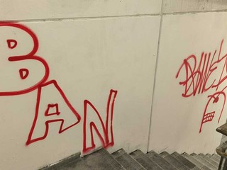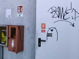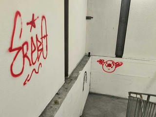 L'azione dei vandali, peraltro, non si è limitata ai soli muri interni delle scale. I segni del passaggio di chi ha agito sono visibili anche al di fuori del vano: la firma «Banned» è comparsa infatti anche sulla scatola antincendio che custodisce l'estintore e sulla porta di ingresso che dà accesso alle scale stesse.