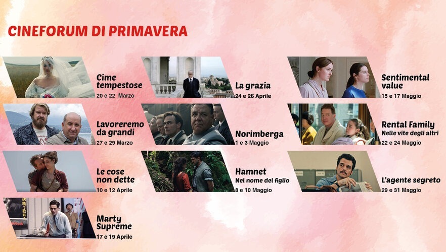La rassegna si avvierà alla conclusione con Rental Family – Nelle vite degli altri (22 e 24 maggio), delicata storia ambientata in Giappone con Brendan Fraser, e terminerà il 29 e 31 maggio con L’agente segreto, thriller politico con Wagner Moura, tra i titoli più apprezzati della recente stagione cinematografica.