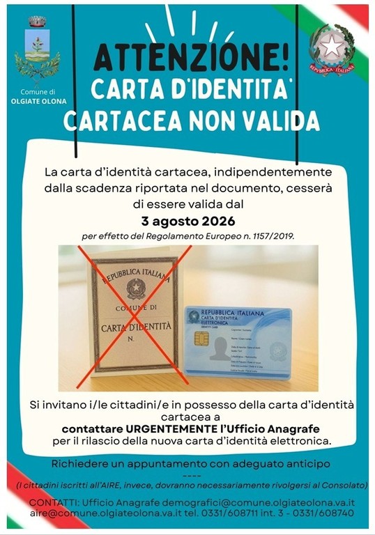 Dal 3 agosto 2026, per effetto del Regolamento europeo n. 1157/2019, la carta d’identità cartacea cesserà di essere valida, indipendentemente dalla data di scadenza riportata sul documento. Tutti i cittadini dovranno quindi dotarsi della nuova Carta d’Identità Elettronica (CIE).
