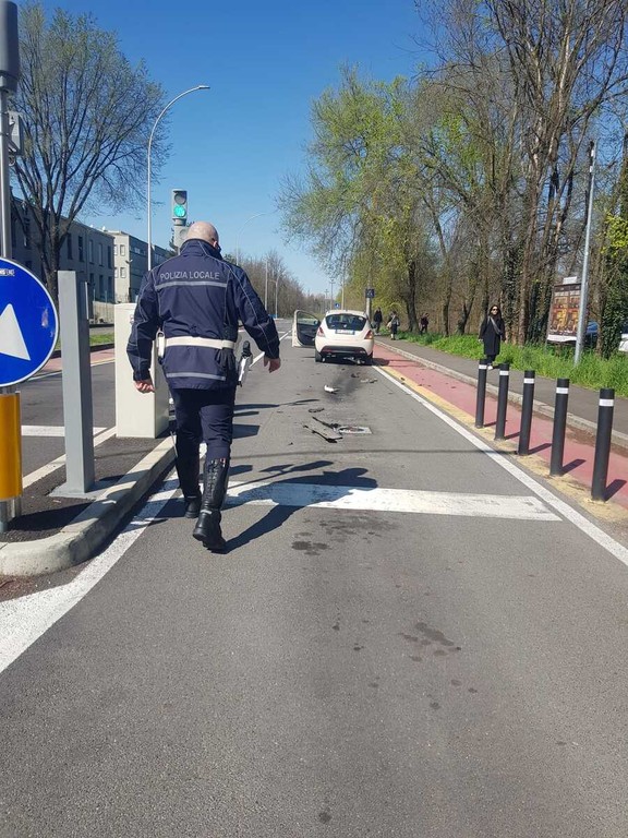 L'impatto, secondo le testimonianze raccolte in loco, potrebbe essere stato causato da una distrazione. La vettura, che stava infilandosi verso la fine della strada aperta al traffico regolare, è andata dritta contro il pilomat che impedisce l'accesso all'area riservata al traffico scolastico, abbattendo completamente il dissuasore e interrompendo la propria marcia pochi metri dopo, a cavallo della pista ciclabile adiacente.