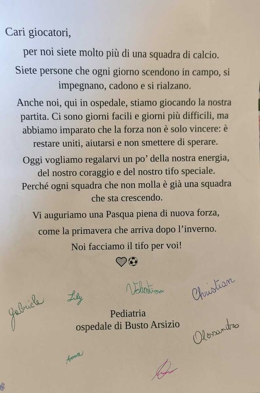 Un messaggio in grado di sciogliere la tensione sportiva e rimettere tutto nella giusta prospettiva: «Oggi vogliamo regalarvi un po' della nostra energia, del nostro coraggio e del nostro tifo speciale – si legge ancora nel messaggio dei piccoli pazienti – Perché ogni squadra che non molla è già una squadra che sta crescendo. Vi auguriamo una Pasqua piena di nuova forza, come la primavera che arriva dopo l'inverno. Noi facciamo il tifo per voi!».