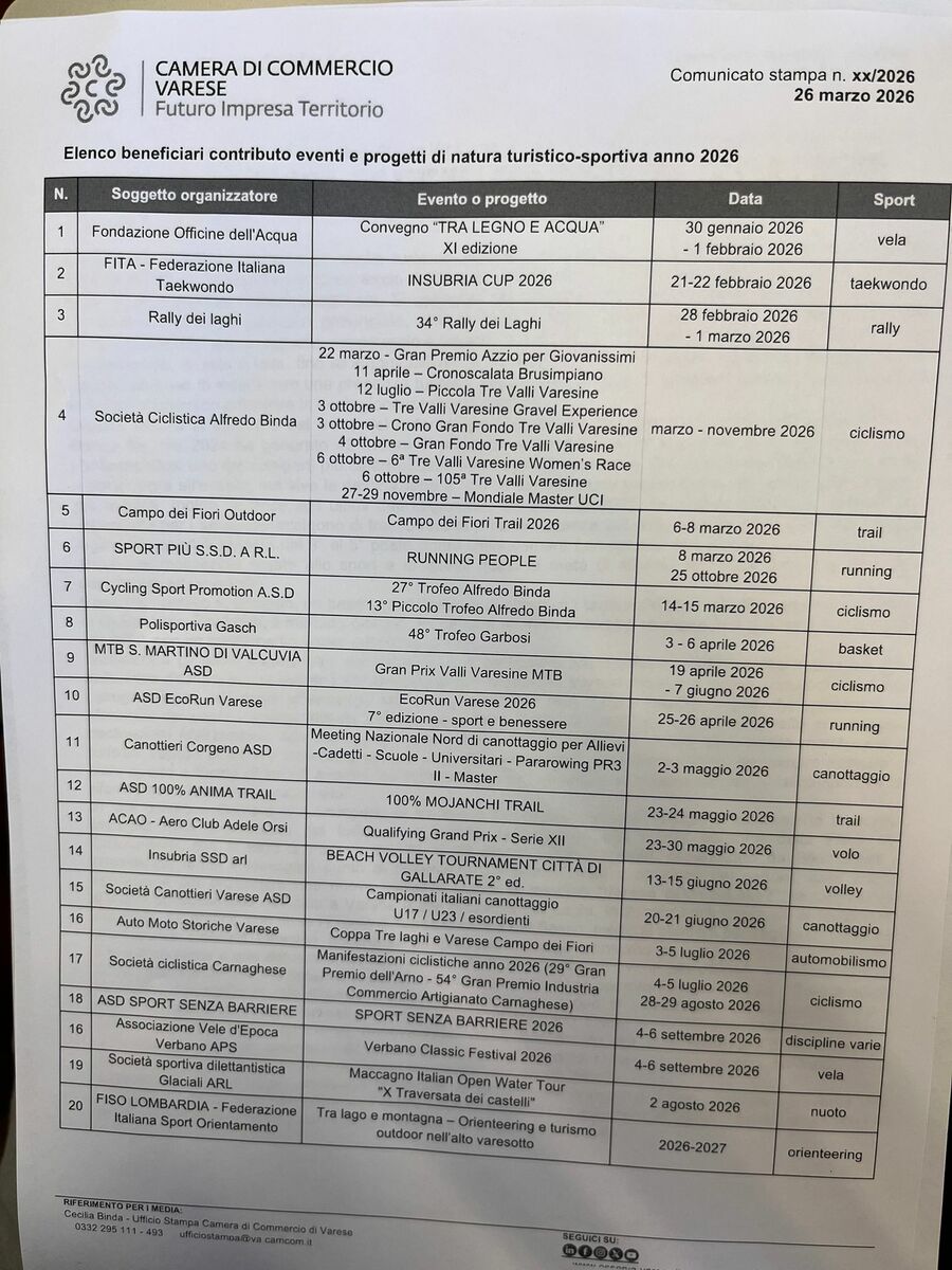 Sono 35 gli eventi e i progetti di natura turistico-sportiva, realizzati da 21 associazioni e società sportive dilettantistiche, a cui Camera di Commercio di Varese e Fondazione Varese Welcome hanno riconosciuto la capacità di qualificare l'offerta territoriale.