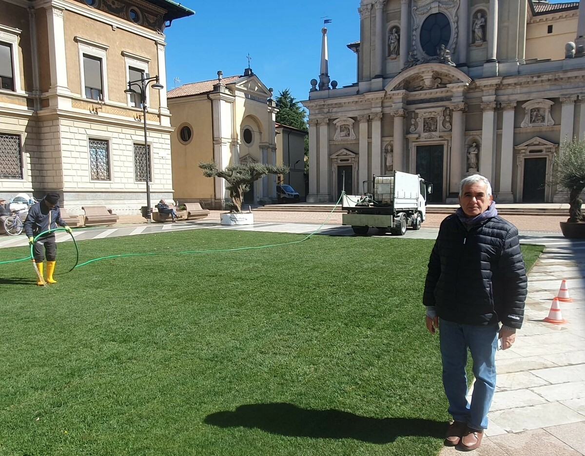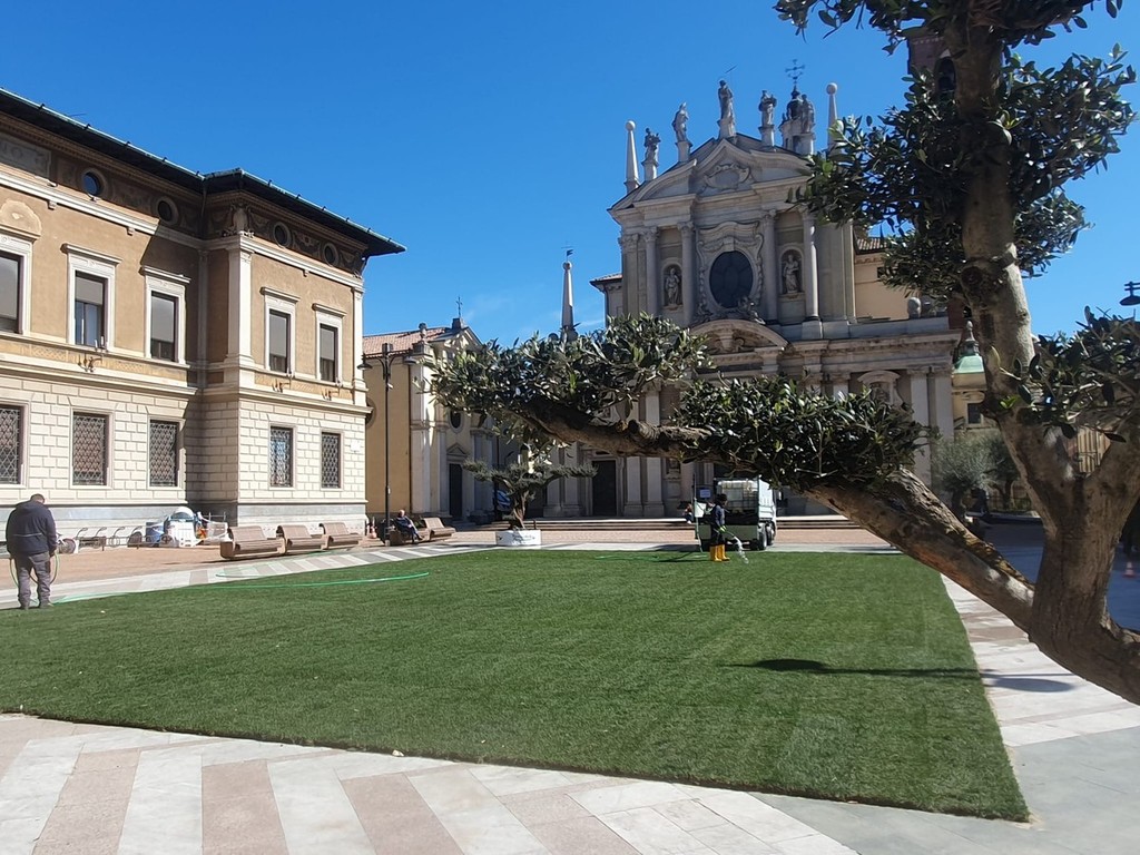 Con la primavera, nel cuore di Busto Arsizio è rispuntato il prato. Da ieri sera, piazza San Giovanni è tornata a tingersi di verde: è stato infatti riposizionato il prato.