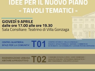 Il primo sarà dedicato al “Centro, quartieri e spazi per la comunità”, e raccoglierà suggerimenti sul centro storico, su Villa Gonzaga, sulle piazze, sui servizi, sul commercio di vicinato e sull’accessibilità.
