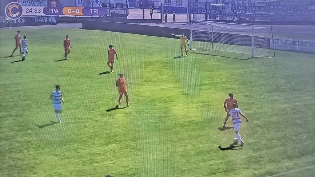 Il gol del vantaggio della Triestina arriva in avvio di ripresa: corner da sinistra di Jonsson, Silvestri svetta su Felicioli e, al 9' della ripresa, 0-1 ospite. La Pro Patria a risalire con i nuovi ingressi: a metà tempo iniziativa di Renelus che converge e serve Citterio appena dentro l'area. Buon controllo e girata di prima intenzione, ma il tiro è troppo centrale e Matosevic respinge ancora.