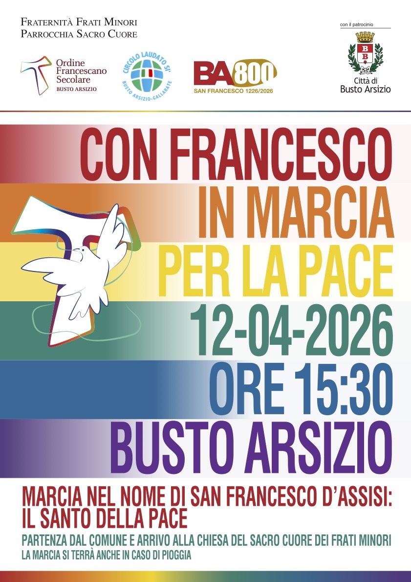 L’Ordine Francescano Secolare di Busto Arsizio, unitamente alla Fraternità dei frati minori della Parrocchia del Sacro Cuore, e con il patrocinio e la collaborazione dell’Amministrazione comunale, promuove una Marcia per la Pace, in occasione dell’ottavo centenario della morte di San Francesco e nell’ambito di un calendario di iniziative dedicate al Santo di Assisi coordinato dall’Assessorato alla Cultura.