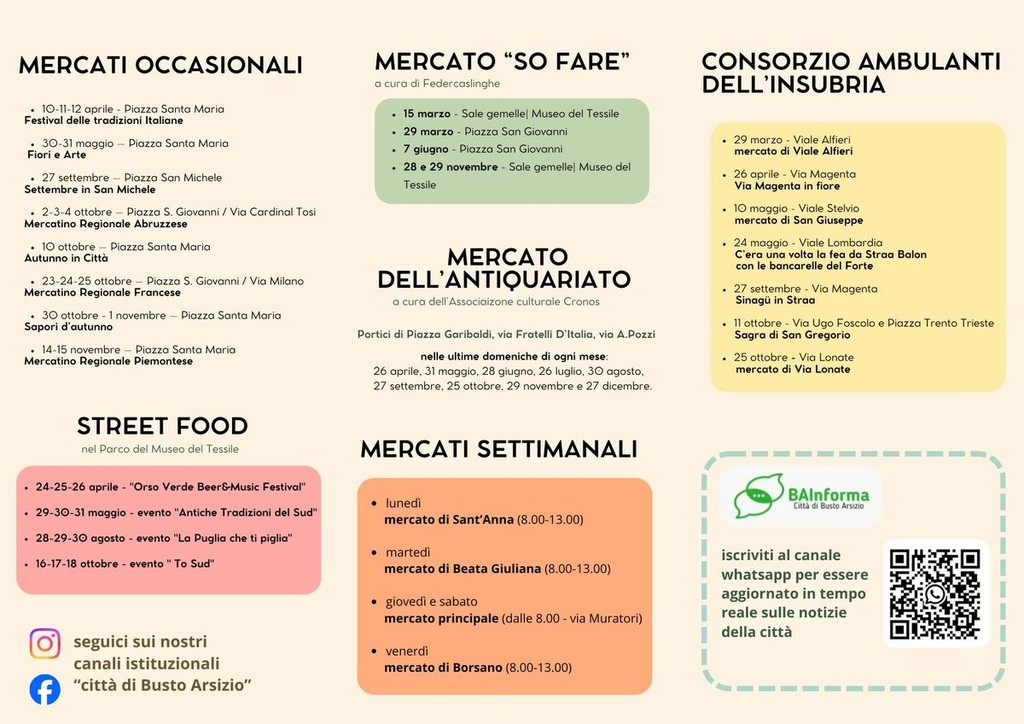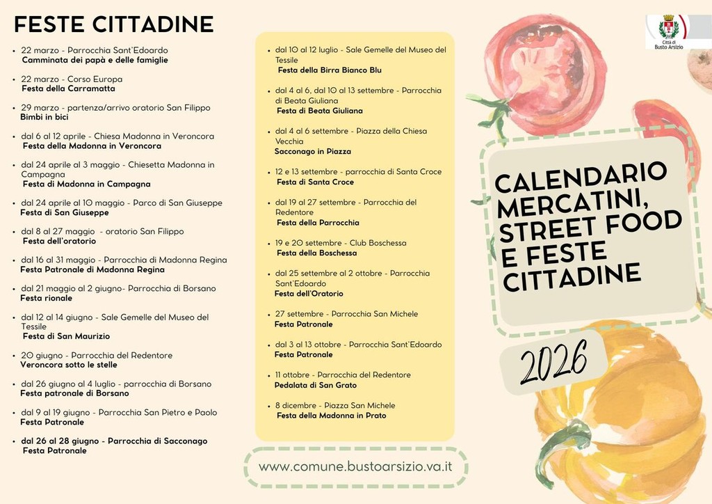 Busto si prepara a un 2026 all’insegna dei mercatini occasionali e dello street food. Su proposta dell’assessore Matteo Sabba, ieri in giunta comunale, è stato approvato il calendario degli eventi che, nel corso dell’anno, animeranno piazze e parchi cittadini con proposte culinarie, artigianali e culturali.