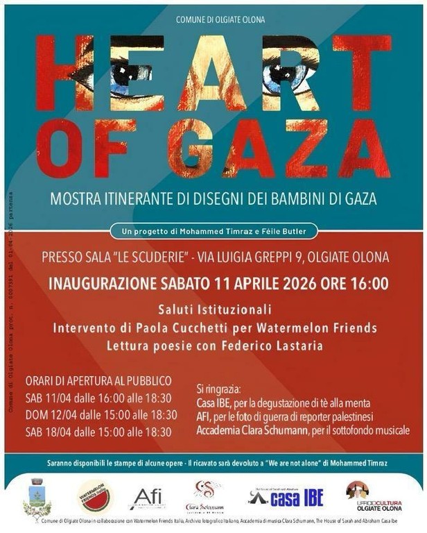 È con queste parole, scritte su un cartello tenuto in mano da alcune bambine, che il vice sindaco di Olgiate Olona Leonardo Richiusa ha voluto aprire l’inaugurazione della mostra "Heart Of Gaza", che raccoglie disegni realizzati dai bambini di Gaza e alcune fotografie messe a disposizione dall’AFI.