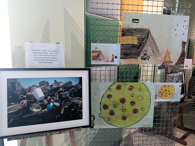 All’interno della sala “Le Scuderie”, infatti, il pubblico ha potuto ammirare alcuni disegni realizzati tra l’ottobre del 2023 e il giugno del 2024 da alcuni bambini di Gaza, intervallati da potenti scatti di guerra che, con il loro contrasto, hanno saputo mostrare egregiamente la differenza tra la realtà di un territorio dilaniato dal conflitto e il mondo come dovrebbe essere, fatto di vita, colori, allegria, sogni e desideri e non di dolore, paura e morte.
