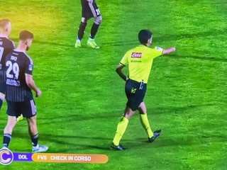 Il primo tempo si esaurirebbe dopo una iniziativa in area biancoblù, ma un contatto tra Marconi e Felicioli induce la panchina di casa (su cui siede Comi in luogo dello squalificato Bonatti) a chiedere la revisione al monitor. Dopo un veloce passaggio, Caruso di Viterbo non ha dubbi e indica il dischetto. Dagli undici metri duello Clemenza-Sala: ha la meglio il giocatore veneto e si va negli spogliatoi sull'1-1.