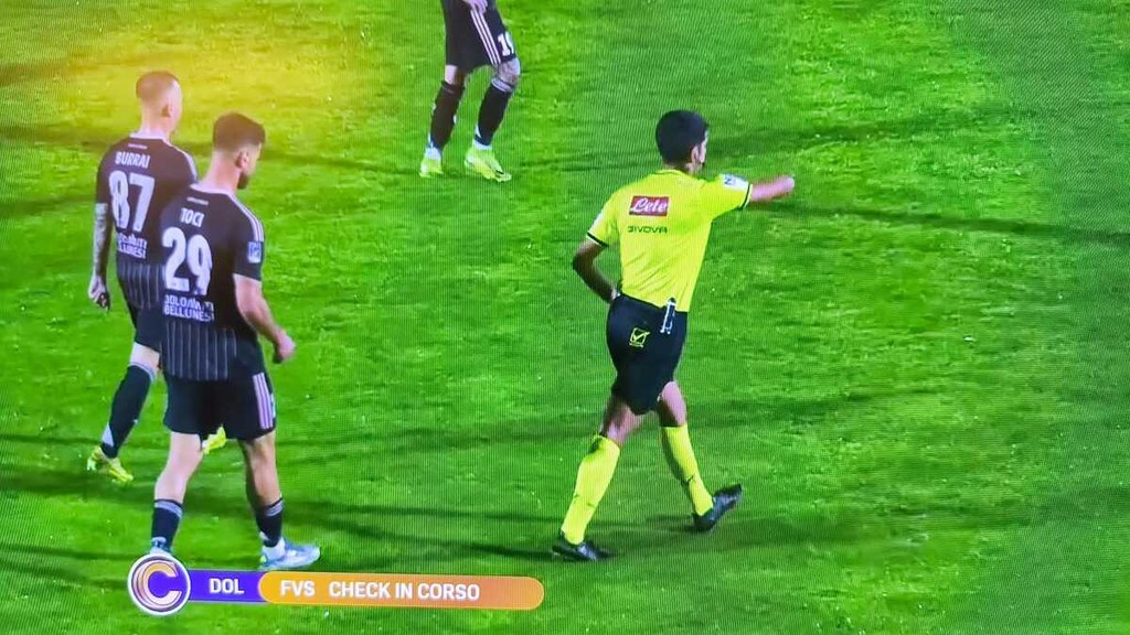 Il primo tempo si esaurirebbe dopo una iniziativa in area biancoblù, ma un contatto tra Marconi e Felicioli induce la panchina di casa (su cui siede Comi in luogo dello squalificato Bonatti) a chiedere la revisione al monitor. Dopo un veloce passaggio, Caruso di Viterbo non ha dubbi e indica il dischetto. Dagli undici metri duello Clemenza-Sala: ha la meglio il giocatore veneto e si va negli spogliatoi sull'1-1.