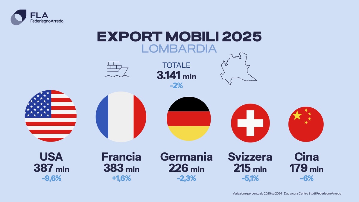 Non solo. La Lombardia si impone come la prima regione (con una quota pari al 29% del totale) per valore esportato della filiera: 4,7 miliardi di euro nel 2025, -1% rispetto al 2024. Solo i mobili, superano il valore di 3 miliardi. Nonostante il calo che sfiora la doppia cifra (9,6%), gli Usa sono ancora la prima destinazione, sul podio inoltre Francia e Germania (appena giù la Svizzera e la Cina. Se i meno compaiono, piuttosto consistente proprio quello cinese.