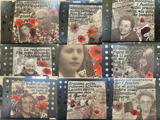All’interno dell’Aula prende forma un percorso visivo che intreccia fotografie d’epoca e linguaggi contemporanei. Le immagini in bianco e nero vengono rielaborate attraverso collage digitali, arricchiti da elementi simbolici come fiori e trame visive. Il filo rosso diventa così metafora potente: connessione tra storie individuali e collettive, segno di continuità tra generazioni, richiamo alla resistenza come tessuto condiviso.