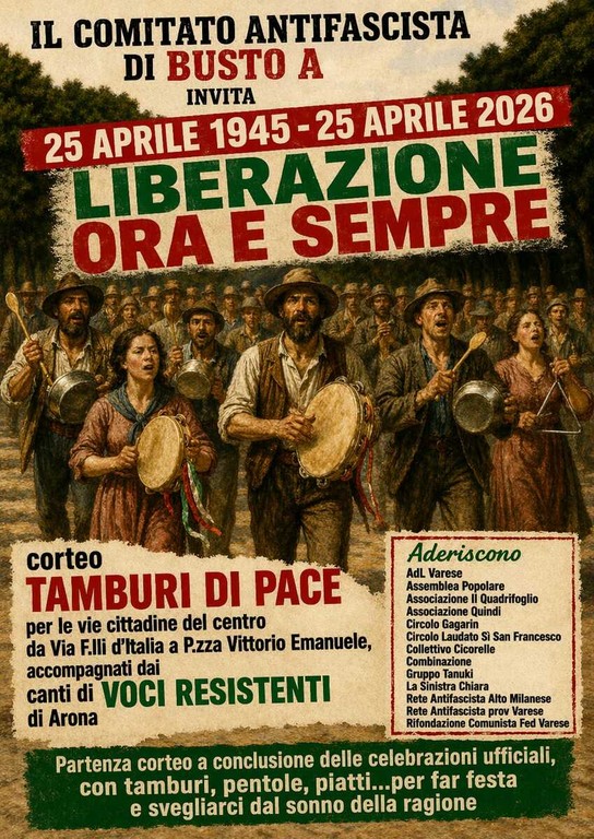 Il pomeriggio sarà preceduto da “Tamburi di pace”, manifestazione che inizierà in tarda mattinata, al termine della celebrazione ufficiale organizzata dal Comune (vedi QUI, l’oratore ufficiale sarà il professor Giorgio Vecchio). Organizzata dal Comitato Antifascista di Busto, l’iniziativa vede aderire Adl Varese, Assemblea Popolare, Il Quadrifoglio, Quindi, Gagarin, Circolo Laudato si’ San Francesco, Collettivo Cicorelle, Combinazione, Gruppo Tanuki, La Sinistra Chiara, Rete Antifascista Alto Milanese, Rete Antifascista provincia di Varese, Rifondazione Comunista Fed Varese.