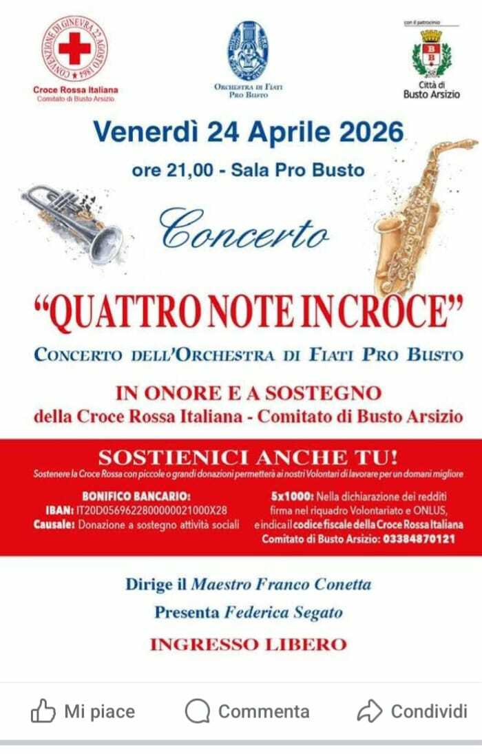 Venerdì 24 aprile, alle ore 21 alla Sala Pro Busto, l’Orchestra di Fiati diretta dal Maestro Franco Conetta, dedica un concerto al Comitato cittadino della Croce Rossa Italiana, dal titolo: “Quattro note in croce”, a sostegno delle attività svolte quotidianamente dal personale della CRI.