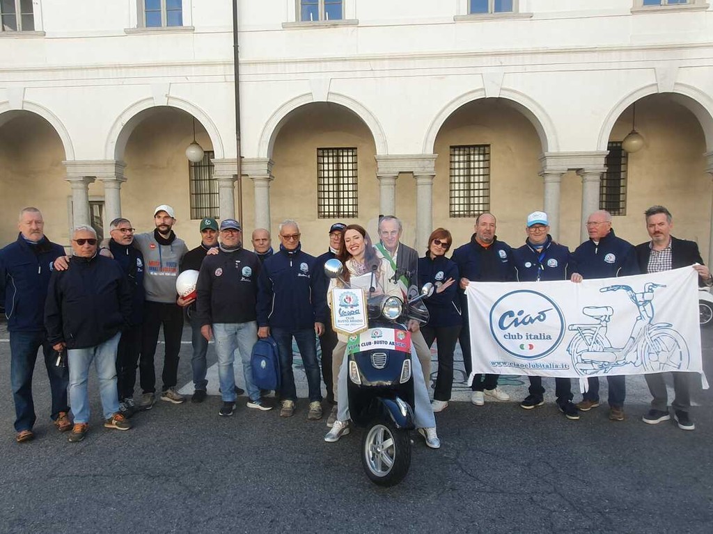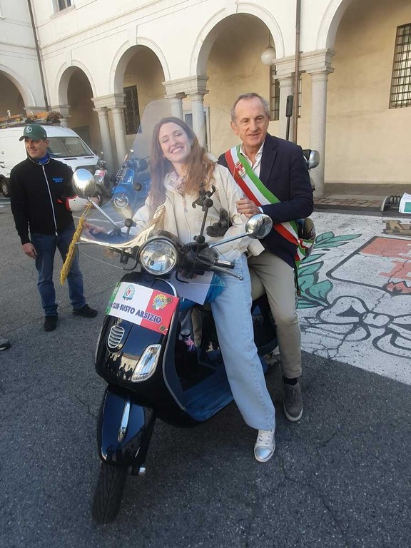 In questi giorni l’artista avrà meno tempo da dedicare ai virtuosismi col proprio strumento: dovrà infatti percorrere 500 chilometri guidando l’iconico “cinquantino” per città e paesini. Il viaggio è cominciato questa mattina dal municipio di Busto: Eleonora è stata “scortata” per un breve tratto dai mezzi a due ruote del Vespa Club cittadino. Ad augurarle buon viaggio anche il sindaco Emanuele Antonelli insieme al consigliere delegato al commercio di vicinato Paolo Geminiani.