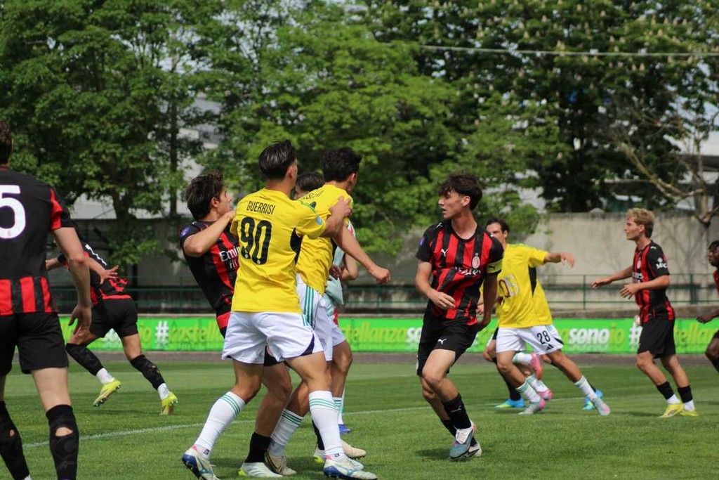 La squadra di casa reagisce prontamente creando due ottime conclusioni con Guerrisi che prima si vede ribattere la conclusione da un difensore rossonero prima di presentarsi a tu per tu con Torriani e successivamente colpisce la traversa con un potente colpo di testa su assist di Chessa.