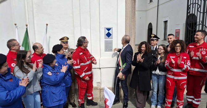 Simbolo di tutela per i beni architettonici, è il primo a essere posizionato in Provincia di Varese. Cerimonia di scopertura al termine di un convegno organizzato da Croce Rossa e Comune. L’assessore Manuela Maffioli: «Un simbolo immateriale...
