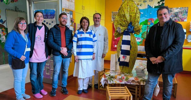 Scambio di doni all’ospedale di Busto. La società biancoblù regala un uovo da 8 chili e la maglia numero 1 alla dottoressa Cherubini. Il reparto risponde con una mongolfiera portafortuna e una lettera commovente che sarà appesa allo Speroni