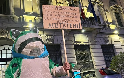 «Aiutatemi»: appello del pelobate davanti a palazzo Borghi ma sul nuovo palazzetto si tira dritto