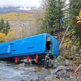 FOTO. Paura in Valtellina: autobus scolastico esce di strada e precipita in un torrente