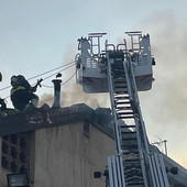 Il tetto di un edificio interessato da un incendio nella mattinata di oggi in zona piazza San Carlo. Viabilità momentaneamente interdetta per consentire le operazioni di spegnimento